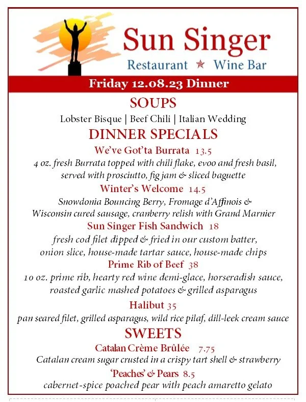 Friday, December 8th Dinner OYSTER WEEK! STARTS FRIDAY, DECEMBER 15THholiday gift baskets? Sun singer has ‘em!- NEED DELIVERY? ORDER THROUGH TOAST! - Rick CarbaughDecember 8, 2023 Facebook0 Twitter Pinterest0 0 Likes