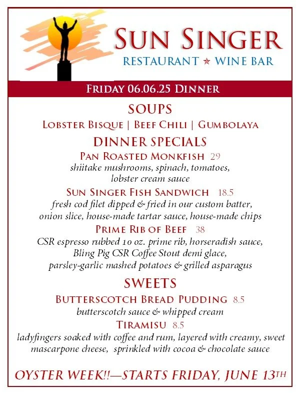 Friday, June 6th Dinner oyster week! June 13th - 21st- ORDER THROUGH TOAST! - Rick CarbaughJune 6, 2025 Facebook0 Twitter Pinterest0 0 Likes