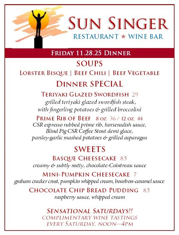 Friday, November 28th Dinner Sun singer will be closed thanksgiving day!- ORDER ONLINE THROUGH TOAST! - Rick CarbaughNovember 28, 2025 Facebook0 Twitter Pinterest0 0 Likes