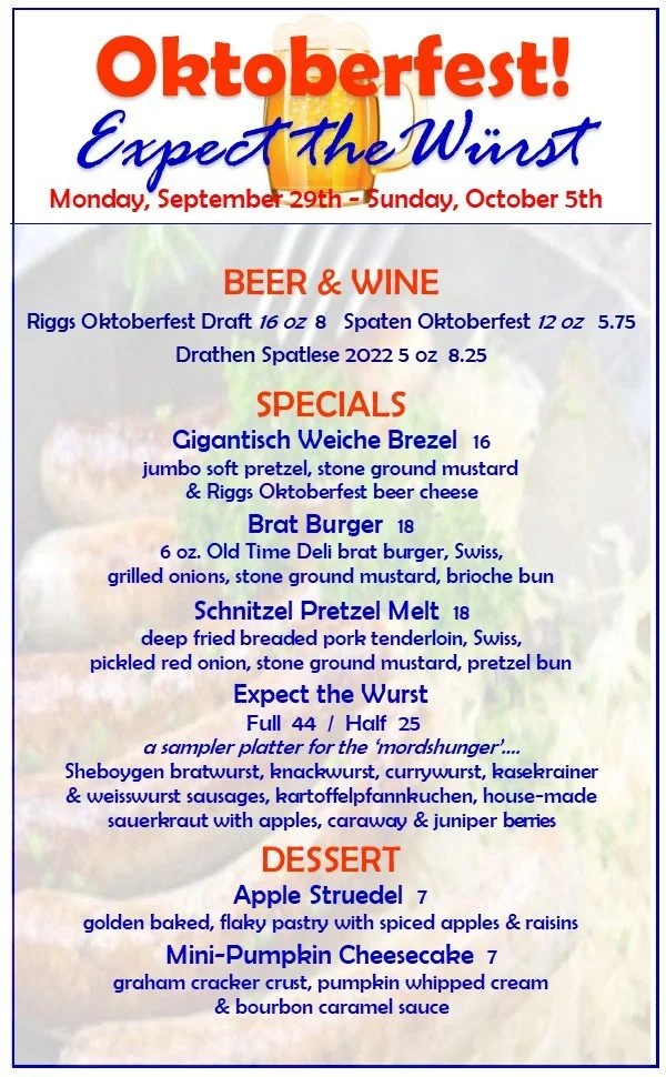 Friday, October 3rd Dinner OCTOBERFEST SPECIALS! NOW THRU oCTOBER 6TH- ORDER ONLINE THROUGH TOAST! - Rick CarbaughOctober 4, 2025 Facebook0 Twitter Pinterest0 0 Likes