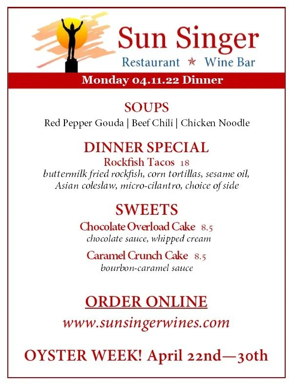 Monday, April 11th Dinner EASTER BRUNCH Sunday, April 17th 10am - 2:30pmOYSTER WEEK! APRIL 22ND - 30THNOW HIRING…ALL POSITIONS! Rick CarbaughApril 11, 2022 Facebook0 Twitter Pinterest0 0 Likes