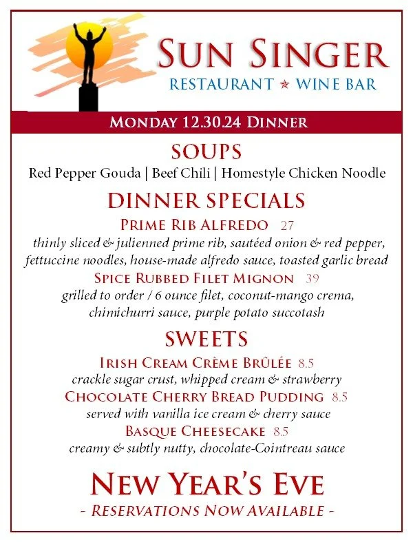 Monday, December 30th Dinner New Year’s eve reserVations now available!- NEED DELIVERY? ORDER THROUGH TOAST! - Rick CarbaughDecember 30, 2024 Facebook0 Twitter Pinterest0 0 Likes