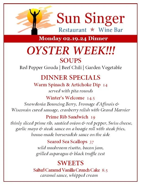 Monday, February 19th Dinner OYSTER WEEK! through Feb. 24th- NEED DELIVERY? ORDER THROUGH TOAST! - Rick CarbaughFebruary 19, 2024 Facebook0 Twitter Pinterest0 0 Likes
