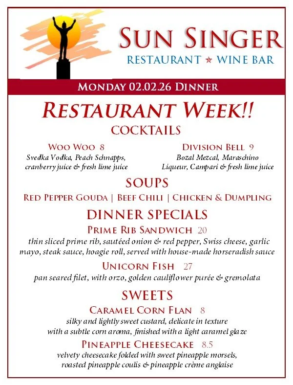 Monday, February 2nd Dinner restaurant week! JAN. 30th - feb. 7th- ORDER ONLINE THROUGH TOAST! - Rick CarbaughFebruary 2, 2026 Facebook0 Twitter Pinterest0 0 Likes