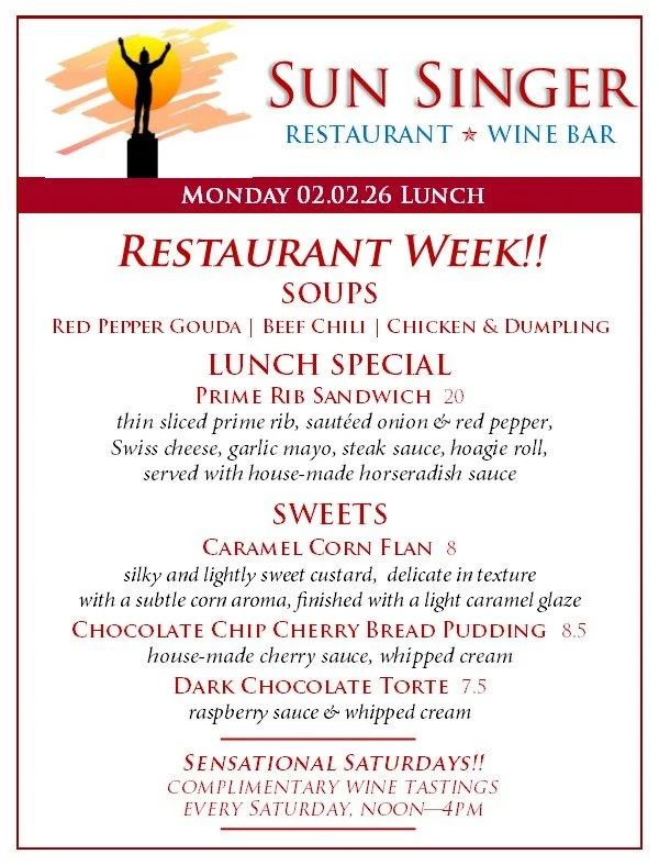 Monday, February 2nd Lunch restaurant week! JAN. 30th - feb. 7th- ORDER ONLINE THROUGH TOAST! - Rick CarbaughFebruary 2, 2026 Facebook0 Twitter Pinterest0 0 Likes
