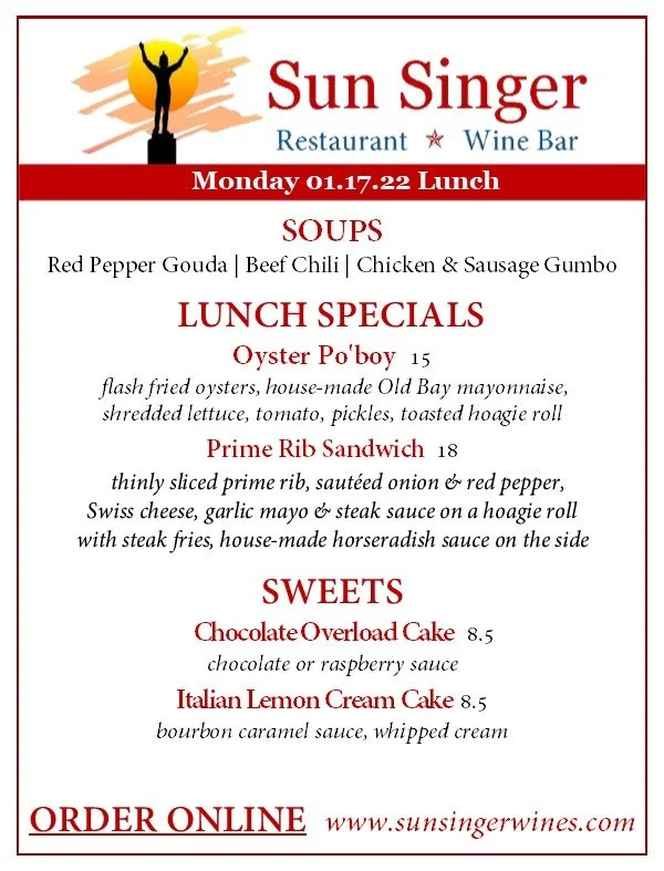 Monday, January 17th Lunch OYSTER WEEK! Now through January 22ndNOW HIRING…ALL POSITIONS! Rick CarbaughJanuary 17, 2022 Facebook0 Twitter Pinterest0 0 Likes