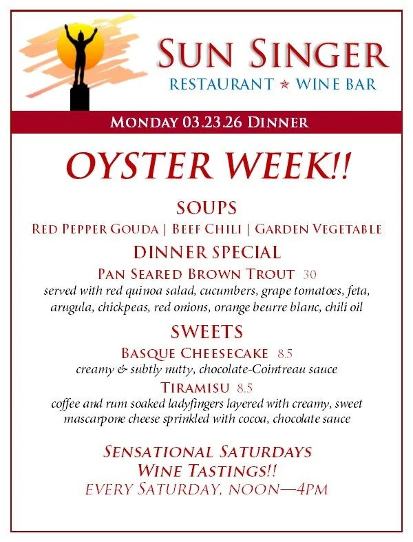 Monday, March 23rd Dinner OYSTER WEEK! March 20 - 28th- ORDER ONLINE THROUGH TOAST! - Rick CarbaughMarch 23, 2026 Facebook0 Twitter Pinterest0 0 Likes