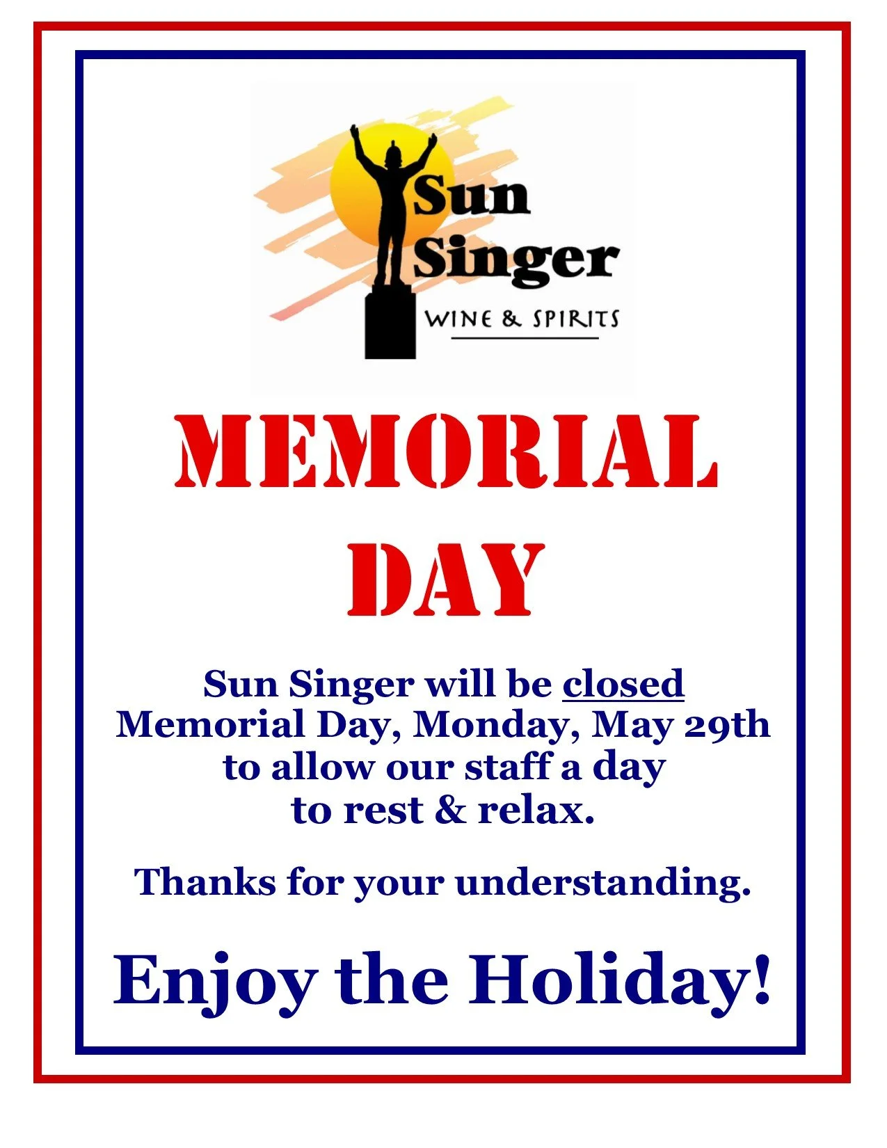 Monday, May 29th SUN SINGER WILL BE CLOSED FOR MEMORIAL DAY Rick CarbaughMay 28, 2023 Facebook0 Twitter Pinterest0 0 Likes