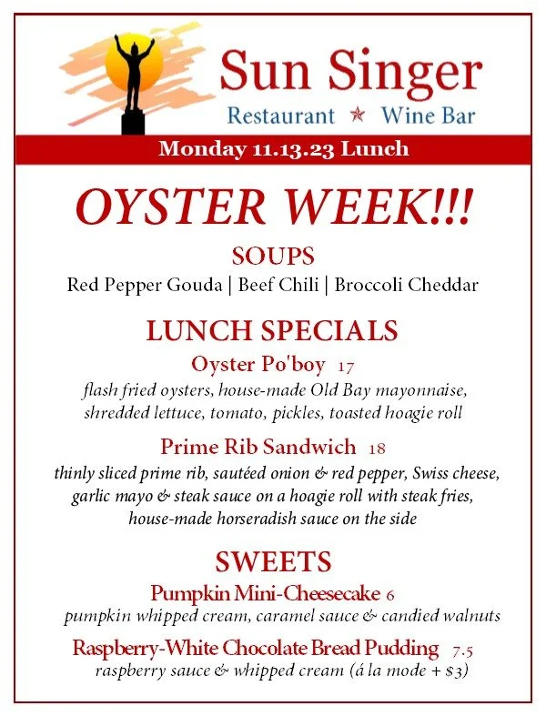 Monday, November 13th Lunch Oyster Week! THRU FRIDAY, NOV. 18TH- NEED DELIVERY? ORDER THROUGH TOAST! - Rick CarbaughNovember 13, 2023 Facebook0 Twitter Pinterest0 0 Likes