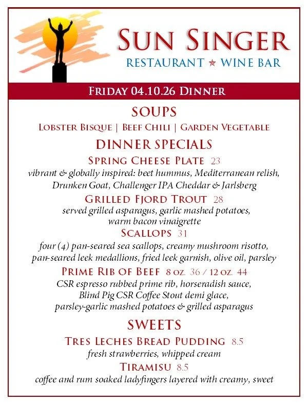 Saturday, April 11th Dinner oyster week! starts friday, april 17th- ORDER ONLINE THROUGH TOAST! - Rick CarbaughApril 11, 2026 Facebook0 Twitter Pinterest0 0 Likes