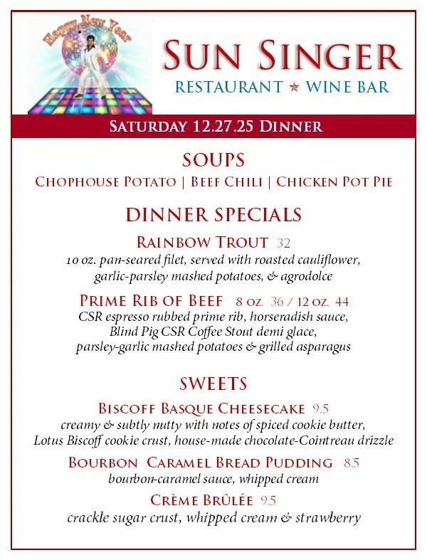 Saturday, December 27th Dinner Let’s think new year’s eve! reservations available!- ORDER ONLINE THROUGH TOAST! - Rick CarbaughDecember 27, 2025 Facebook0 Twitter Pinterest0 0 Likes