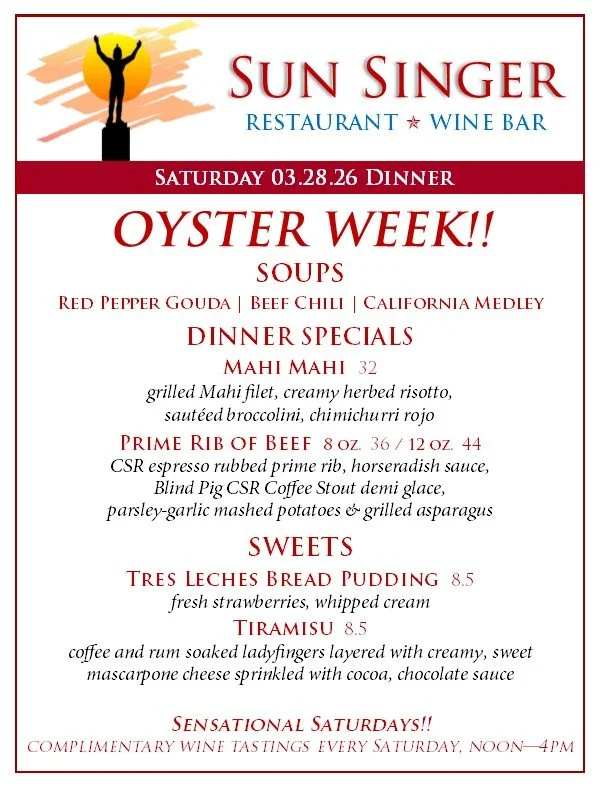 Saturday, March 28th Dinner OYSTER WEEK! March 20 - 28th- ORDER ONLINE THROUGH TOAST! - Rick CarbaughMarch 28, 2026 Facebook0 Twitter Pinterest0 0 Likes