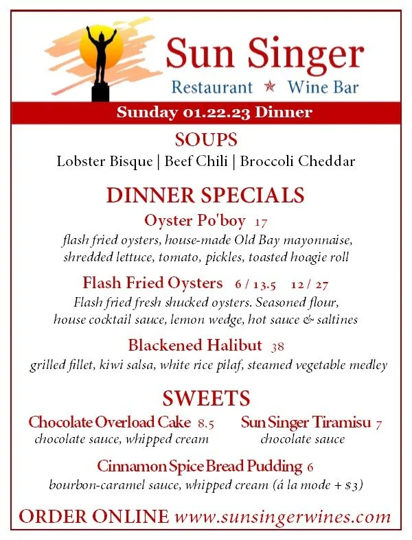 Sunday, January 22nd Dinner - DELIVERY AVAILABLE THROUGH TOAST - Rick CarbaughJanuary 22, 2023 Facebook0 Twitter Pinterest0 0 Likes