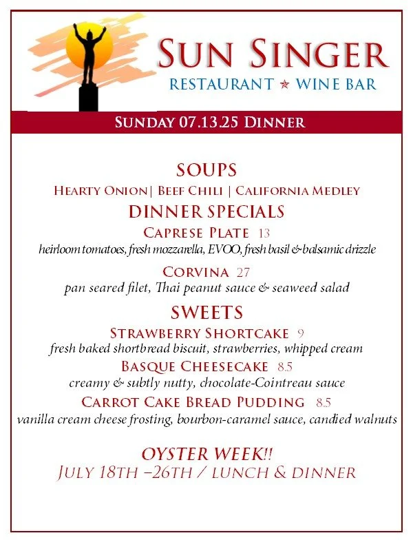 Sunday, July 13th Dinner OYSTER WEEK! JULY 18TH - 26TH- ORDER ONLINE THROUGH TOAST! - Rick CarbaughJuly 13, 2025 Facebook0 Twitter Pinterest0 0 Likes