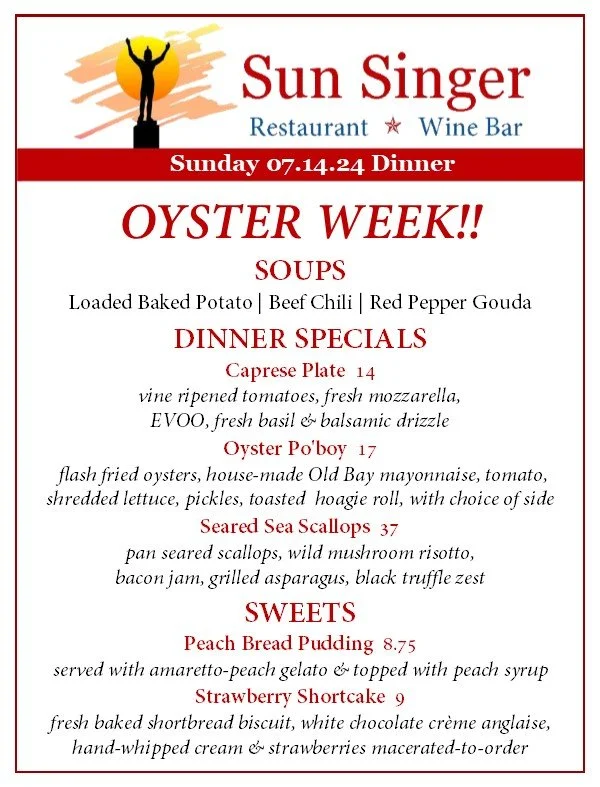 Sunday, July 14th Dinner OYSTER WEEK! FRI., JULY 12TH - Sat., july 20th LUNCH/DINNER- NEED DELIVERY? ORDER THROUGH TOAST! - Rick CarbaughJuly 14, 2024 Facebook0 Twitter Pinterest0 0 Likes