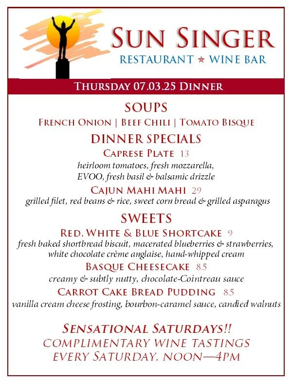 Thursday, July 3rd Dinner OYSTER WEEK! JULY 18TH - 26TH- ORDER ONLINE THROUGH TOAST! - Rick CarbaughJuly 3, 2025 Facebook0 Twitter Pinterest0 0 Likes