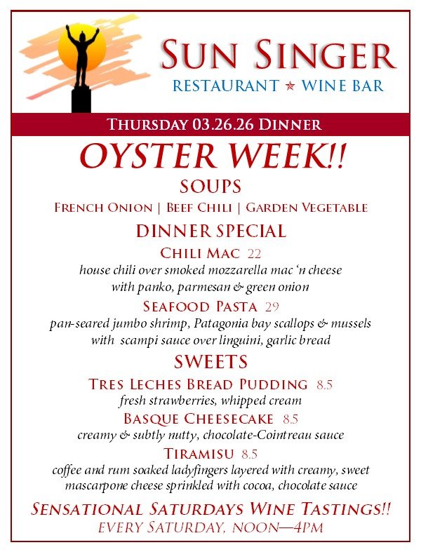 Thursday, March 26th Dinner OYSTER WEEK! March 20 - 28th- ORDER ONLINE THROUGH TOAST! - Rick CarbaughMarch 26, 2026 Facebook0 Twitter Pinterest0 0 Likes