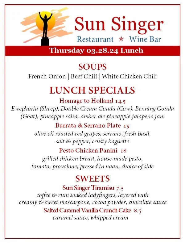 Thursday, March 28th Lunch stopped by the sun singer deli lately?- NEED DELIVERY? ORDER THROUGH TOAST! - Rick CarbaughMarch 28, 2024 Facebook0 Twitter Pinterest0 0 Likes