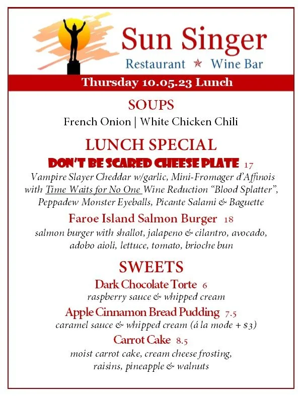 Thursday, October 5th Lunch GORGEOUS GIFT BASKETS? SUN SINGER HAS THEM!- NEED DELIVERY? ORDER THROUGH TOAST! - Rick CarbaughOctober 5, 2023 Facebook0 Twitter Pinterest0 0 Likes