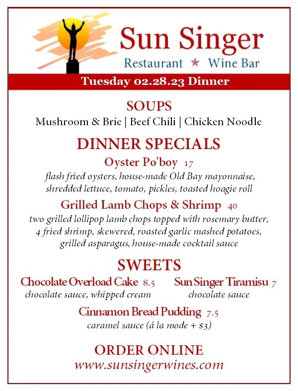 Tuesday, February 28th Dinner - DELIVERY AVAILABLE THROUGH TOAST - Rick CarbaughFebruary 28, 2023 Facebook0 Twitter Pinterest0 0 Likes