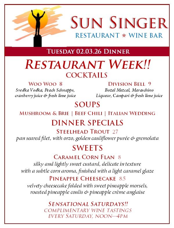 Tuesday, February 3rd Dinner restaurant week! JAN. 30th - feb. 7th- ORDER ONLINE THROUGH TOAST! - Rick CarbaughFebruary 3, 2026 Facebook0 Twitter Pinterest0 0 Likes