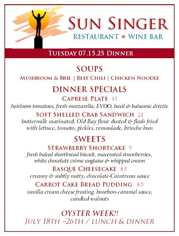 Tuesday, July 15th Dinner OYSTER WEEK! JULY 18TH - 26TH- ORDER ONLINE THROUGH TOAST! - Rick CarbaughJuly 15, 2025 Facebook0 Twitter Pinterest0 0 Likes