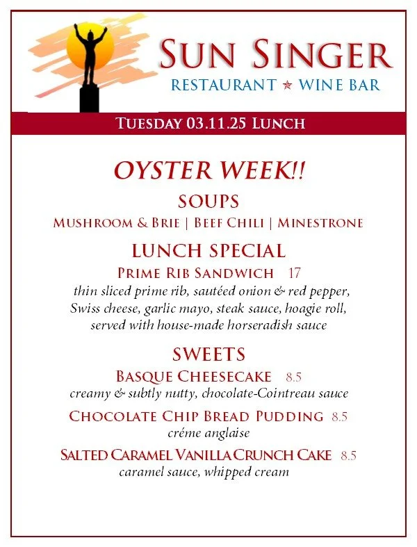 Tuesday, March 11th Lunch It’s Oyster Week! Lunch & dinner thru MARCH 15TH- NEED DELIVERY? ORDER THROUGH TOAST! - Rick CarbaughMarch 11, 2025 Facebook0 Twitter Pinterest0 0 Likes