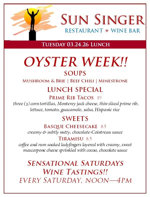 Tuesday, March 24th Lunch OYSTER WEEK! March 20 - 28th- ORDER ONLINE THROUGH TOAST! - Rick CarbaughMarch 24, 2026 Facebook0 Twitter Pinterest0 0 Likes