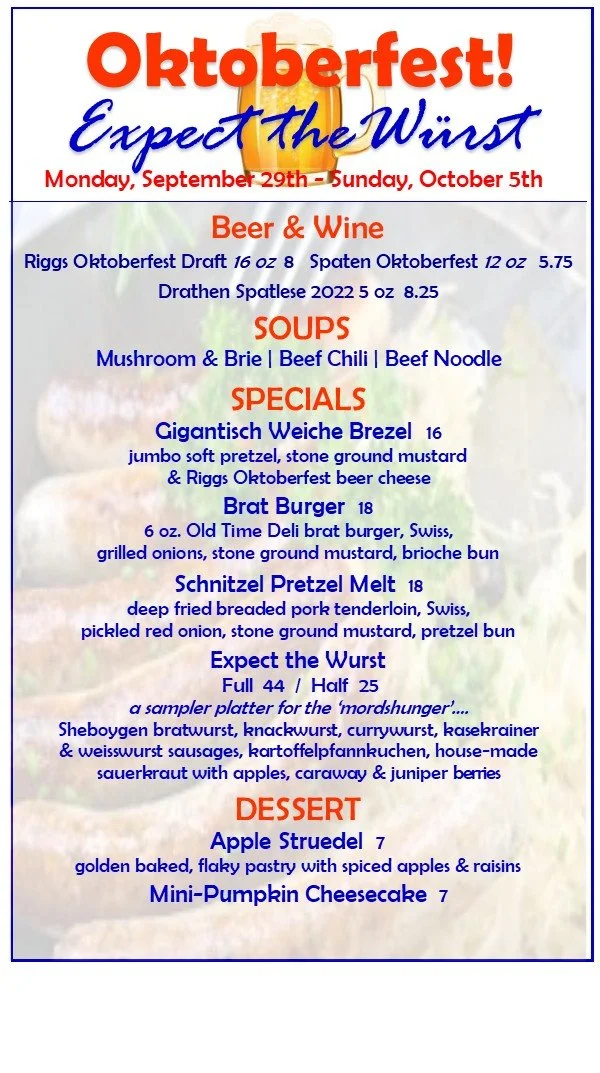 Tuesday, September 30th Lunch OCTOBERFEST SPECIALS! NOW THRU oCTOBER 6TH- ORDER ONLINE THROUGH TOAST! - Rick CarbaughSeptember 30, 2025 Facebook0 Twitter Pinterest0 0 Likes