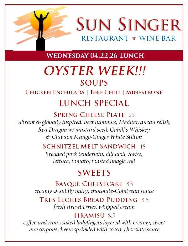 Wednesday, April 22nd Lunch OYSTER WEEK! April 17 - 25- ORDER ONLINE THROUGH TOAST! - Rick CarbaughApril 22, 2026 Facebook0 Twitter Pinterest0 0 Likes