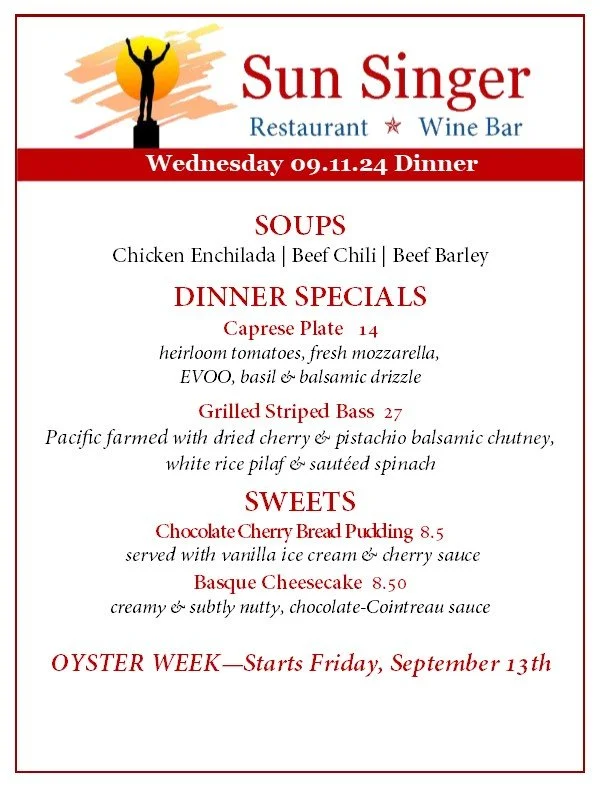 Wednesday, September 11th Dinner oyster week! september 13th - 21st- NEED DELIVERY? ORDER THROUGH TOAST! - Rick CarbaughSeptember 11, 2024 Facebook0 Twitter Pinterest0 0 Likes