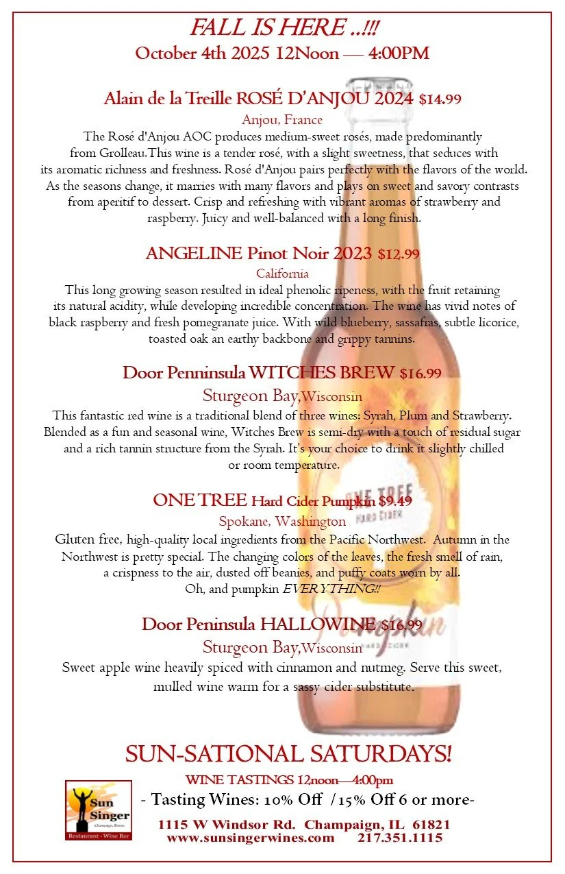 COMPLIMENTARY SUN-SATIONAL WINE TASTING SATURDAY OCTOBER 4TH 2025 FROM 12NOON TO 4PM saturday tasting! 12noon - 4:00pm-Save 15% on purchases of 6 or more Tasting Wines- Rick CarbaughOctober 3, 2025 Facebook0 Twitter Pinterest0 0 Likes