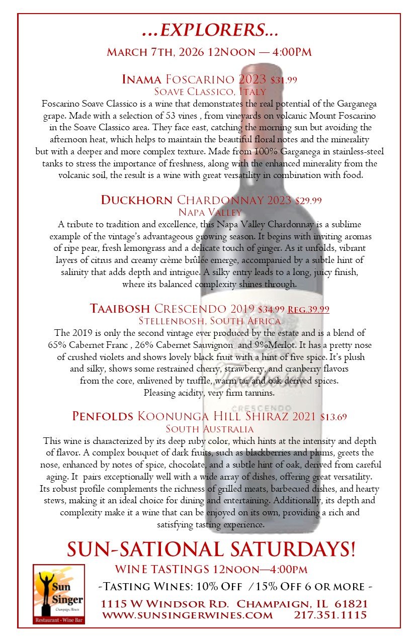 SUN-SATIONAL SATURDAY COMPLIMENTARY WINE TASTING FROM 12NOON TO FOUR PM MARCH 7th 2026!! saturday tasting! 12noon - 4:00pm-Save 15% on purchases of 6 or more Tasting Wines- Rick CarbaughMarch 6, 2026 Facebook0 Twitter Pinterest0 0 Likes
