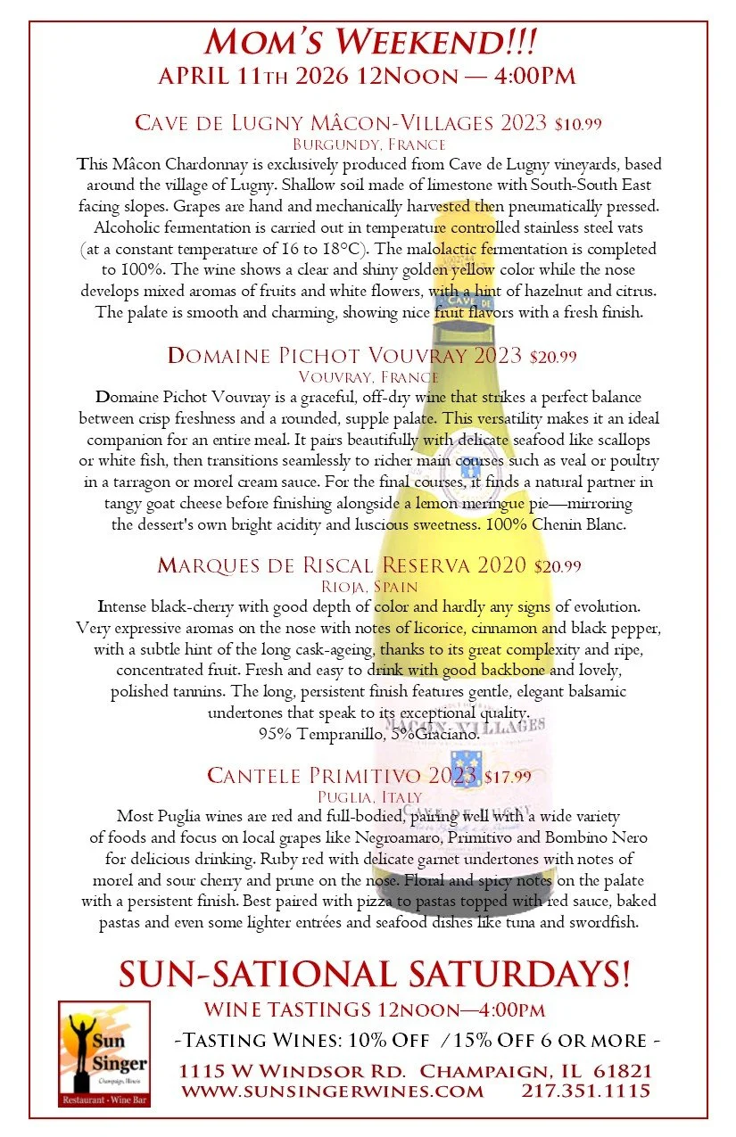 SUN-SATIONAL COMPLIMENTARY WINE TASTING SATURDAY APRIL 11TH FROM 12-NOON TO FOUR PM!!!! saturday tasting! 12noon - 4:00pm-Save 15% on purchases of 6 or more Tasting Wines- Rick CarbaughApril 10, 2026 Facebook0 Twitter Pinterest0 0 Likes