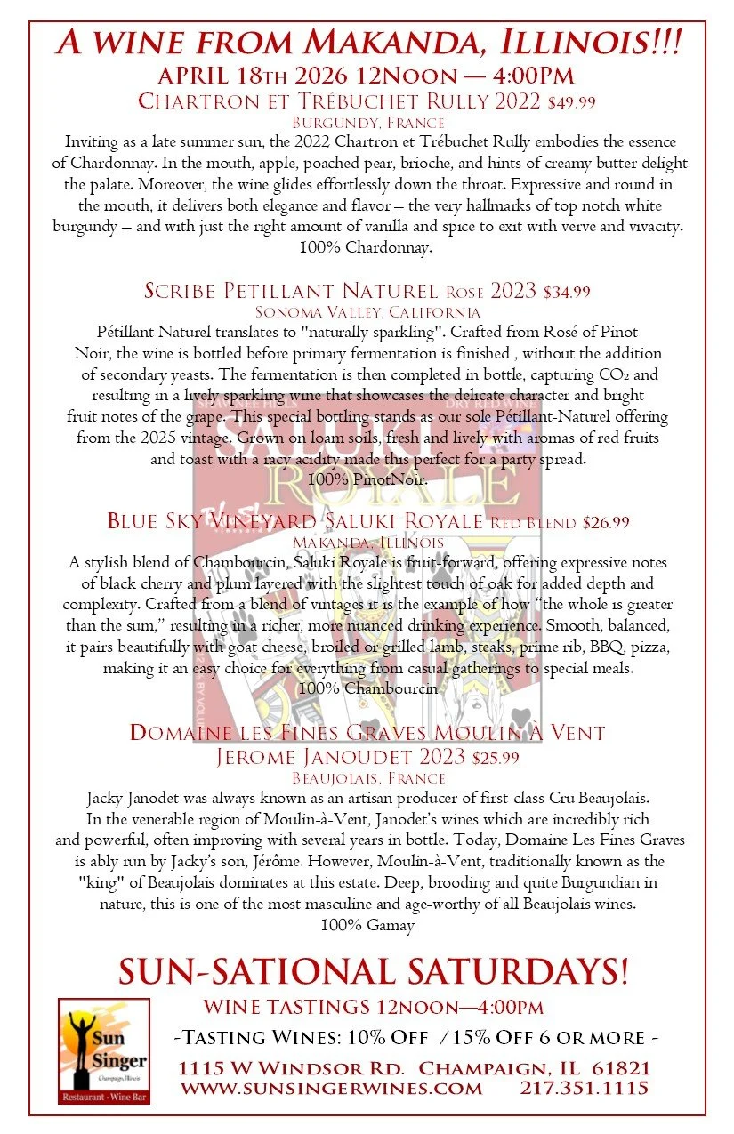 Sun-Sational Complimentary Wine Tasting Saturday April 18th from 12Noon to Fourpm !!!! saturday tasting! 12noon - 4:00pm-Save 15% on purchases of 6 or more Tasting Wines- Rick CarbaughApril 17, 2026 Facebook0 Twitter Pinterest0 0 Likes