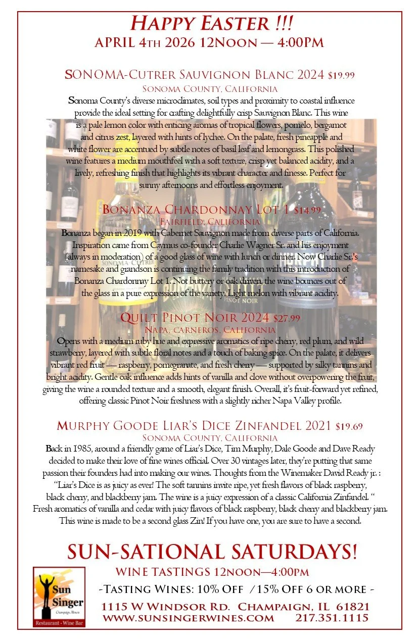SUN-SATIONAL COMPLIMENTARY WINE TASTING SATURDAY APRIL 4th FROM 12NOON TO FOUR PM !!!!! saturday tasting! 12noon - 4:00pm-Save 15% on purchases of 6 or more Tasting Wines- Rick CarbaughApril 3, 2026 Facebook0 Twitter Pinterest0 0 Likes